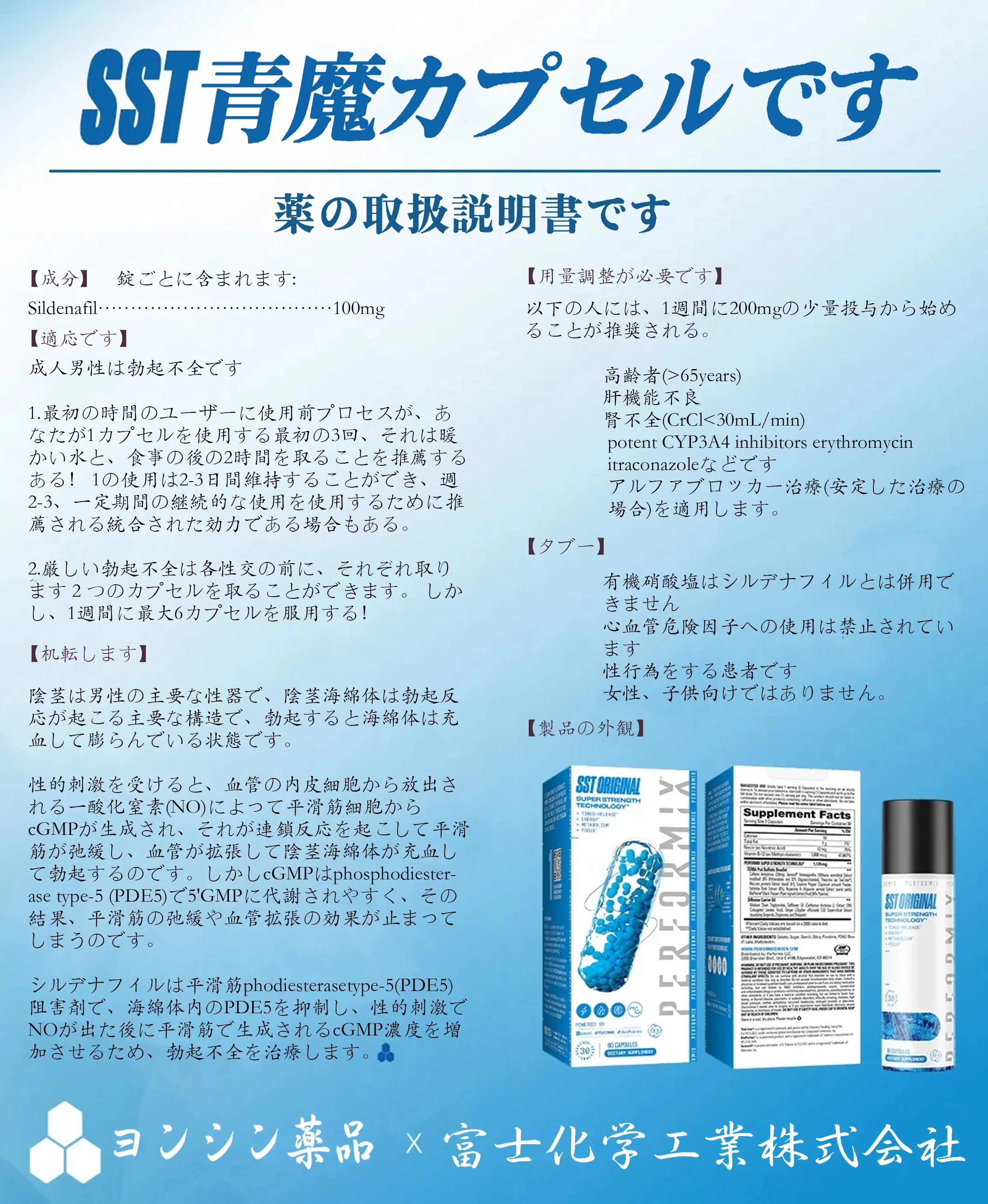 富士工業株式会社が世界各国と共同開発青魔カプセルです、TERRAインテリジェント徐放技術により、5分で効果が現れ、ペニスを最大18センチ増大させ、硬さを72時間持続させることができる!